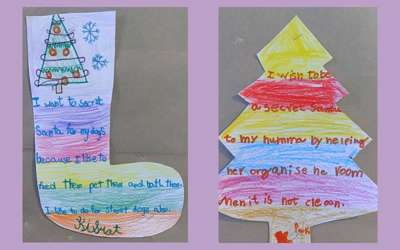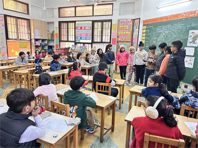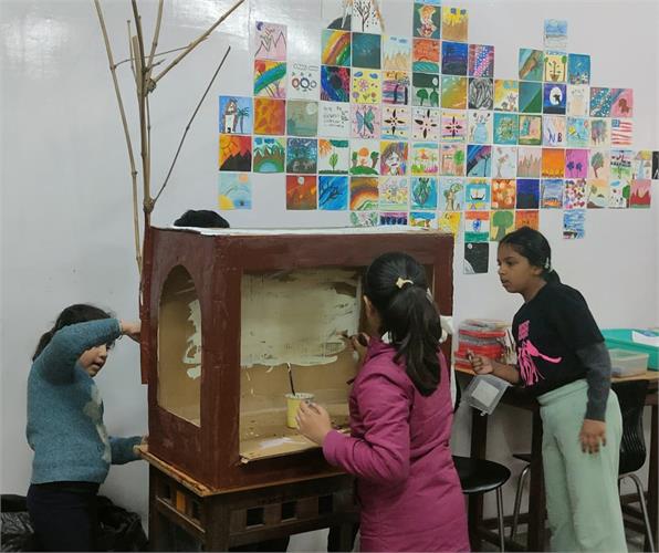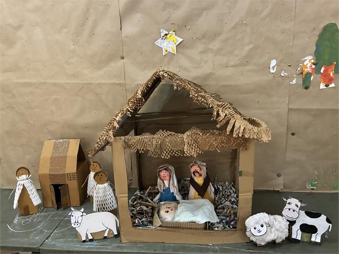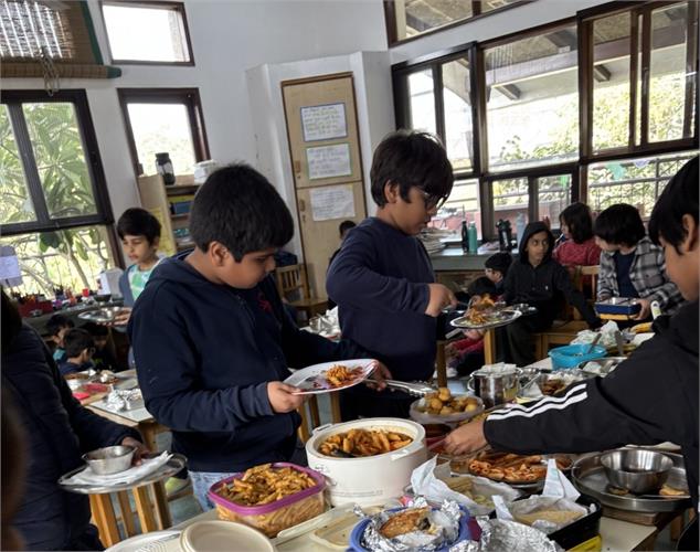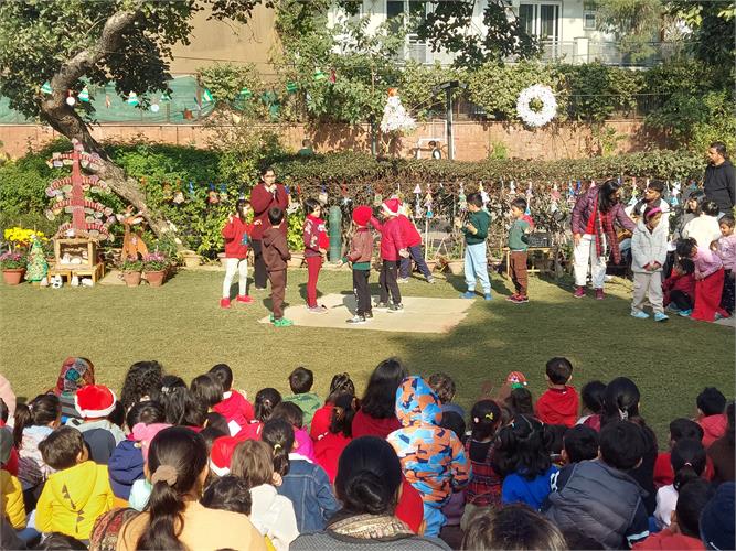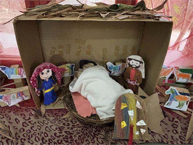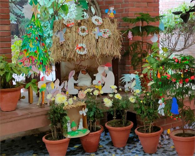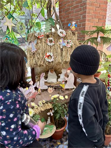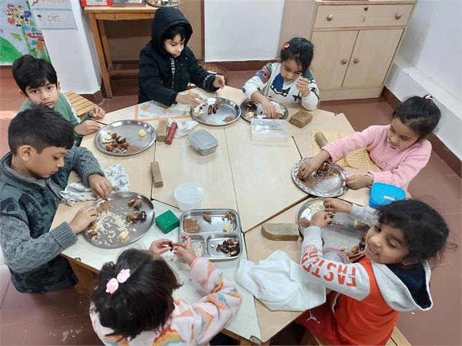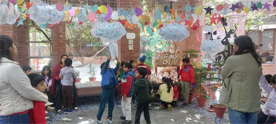 Children reflected on the year gone by and shared the people, moments and experiences they were thankful for. These thoughts came together in a collective creation called the ‘Sky of Gratitude.’ A manger at the reception area made by the children and didis gave children across grades a chance to pause and touch the quiet spirit of Christmas. The little ones were captivated by stories about the birth of Jesus through a roleplay by didis. Nativity scenes were created in each group using recyclable material. Children connected lovingly with Baby Jesus in their group, “let's talk softly, baby is sleeping, चपु है चदंा... गा सकते हैं।” Making Christmas goodies with dates and dry fruits was another highlight for our children. “मनैं ेबहुत सारी dates में dry fruits stuff कर दिये हैं, अपने लिए और अपनी family के लिए ”.