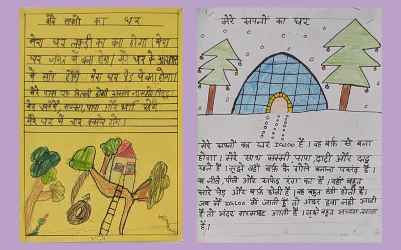 Imagination took flight as they embarked on a creative journey to visualize their dream house structures. They expressed ideas through a write-up 'मेरे सपनों का घर', describing the features and uniqueness.