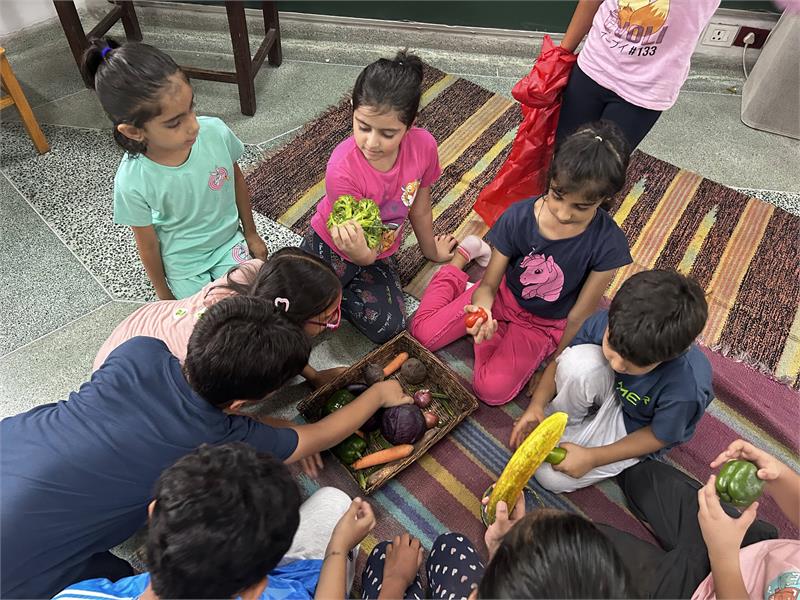 To further enrich their learning, the children visited ‘Mogly Farm’, where they interacted with farm animals such as cows, goats, emus, rabbits, guinea pigs, chickens, ducks etc. and observed their shelter homes and their food. Feeding and petting the animals provided a hands-on experience, connecting their classroom learning to the real world.