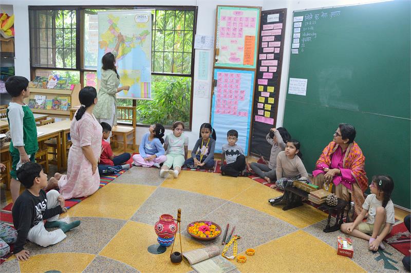 The togetherness of family further merged with the festival of Diwali. Through guided meditation, children reflected on the ‘inner light’ that guides them in different situations. They further pondered on the different qualities, aspects and places which they would like to illuminate, such as “I have placed my diya on my tongue so that I can say good words to my friends and family”. Carrying the light within them, children joyfully participated in the preparation of the festival of lights. They thoroughly enjoyed creating Diwali decorations ‘Toran’, painting diya, cleaning their space and celebrating the essence of Diwali by spending time together with their loved ones.