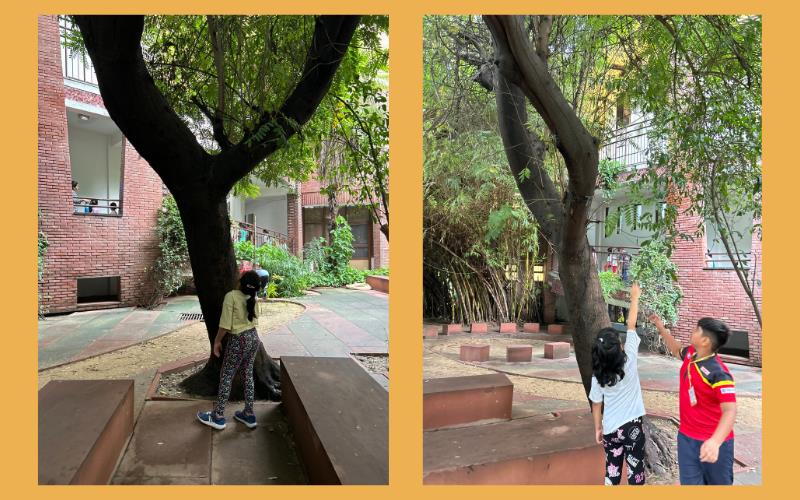 The theme then evolved into Classification of Plants - identifying climbers, creepers, herbs, shrubs, and trees. Children made insightful observations during their nature walks, noticing examples like the mango tree, lemon and hibiscus shrubs, madhu malti, money plant, and mint around Shikshantar.