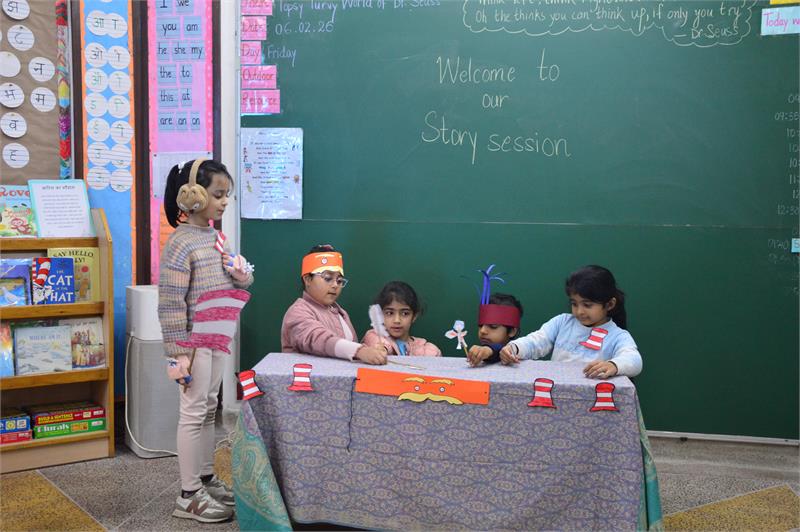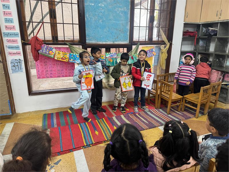 Class I was abuzz with excitement, imagination, and creativity as they delved into the topsy-turvy world of Dr. Seuss. With wide smiles, the children sat in a cozy reading corner,discovering the joy of rhyming words and the magic of each character they met. Their creativity shone through as they explored the clever usage of not just sensible words but also nonsensical rhyming words to create their own interesting sentences. Throughout the week, the children immersed themselves in reading a variety of Dr. Seuss books and connected with the essence of characters like Horton, the Lorax, the Grinch, Thidwick, Sneetches, and many more. Their love for Dr. Seuss further encouraged them to create their own booklets that rhymed in Dr. Seuss's style. Through creative expressions, imaginative and invented spellings, they completed their booklets, writing, and drawing about the different characters and all the wacky things they could spot around. With a sense of joy and pride, children read aloud their stories to each other. The big hearts of the Grinch and Thidwick, the care of the Lorax for nature, and the kindness of Horton merged seamlessly with the Christmas festival. Through guided meditation and story narrations, the children reflected on the aspect of kindness and built an understanding of spreading the joy of love and kindness during Christmas. Carrying the spirit of sharing and caring, they celebrated and decorated the Christmas with the 'Tree of Kindness.'
